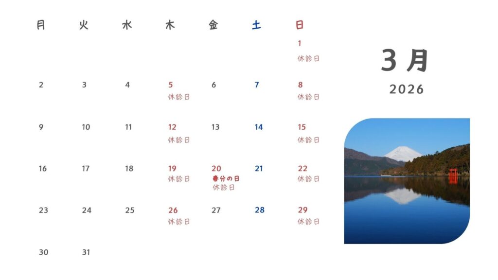 綱島駅から歩いて1分の歯医者、篠崎歯科医院です。2026年3月の休診日をお知らせします。